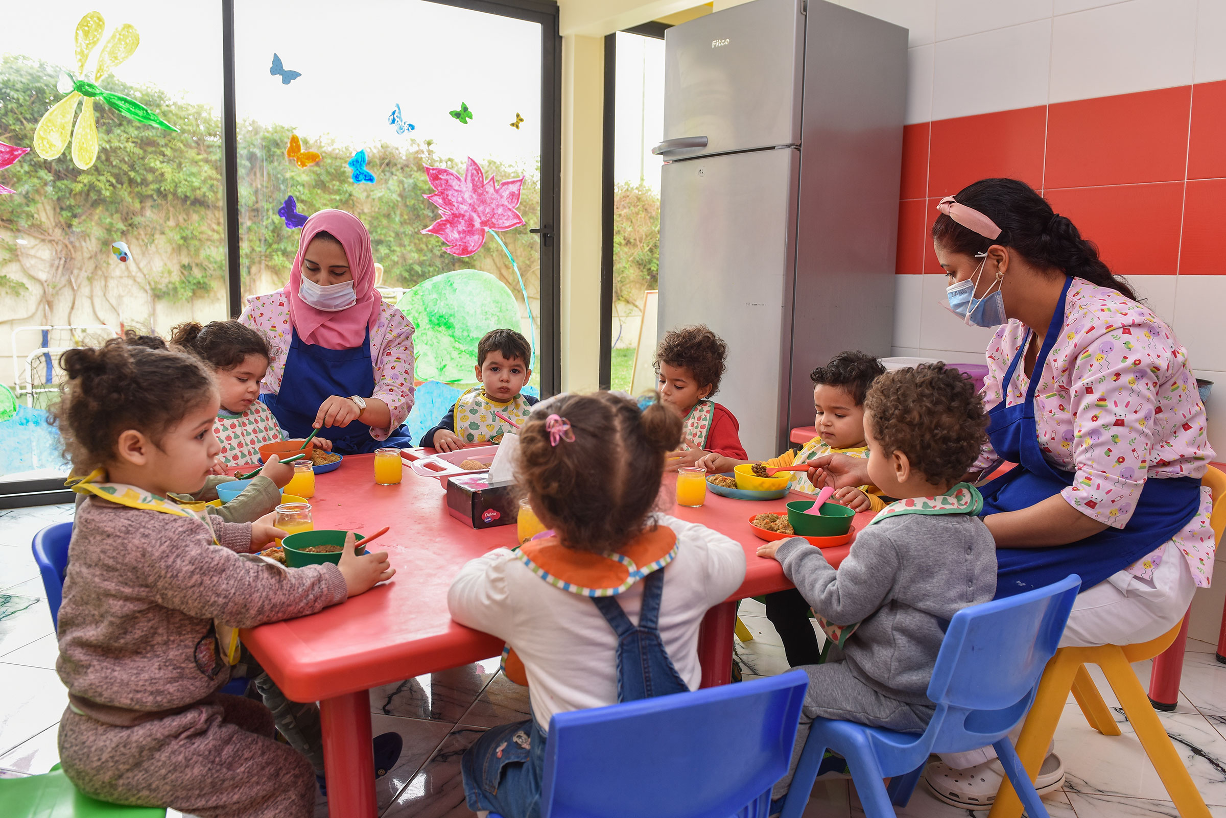 Après lavage des petites mains et port du bavoir pour les plus petits, les enfants sont installés par table de plusieurs enfants et assistés par l’éducatrice et l’assistante.